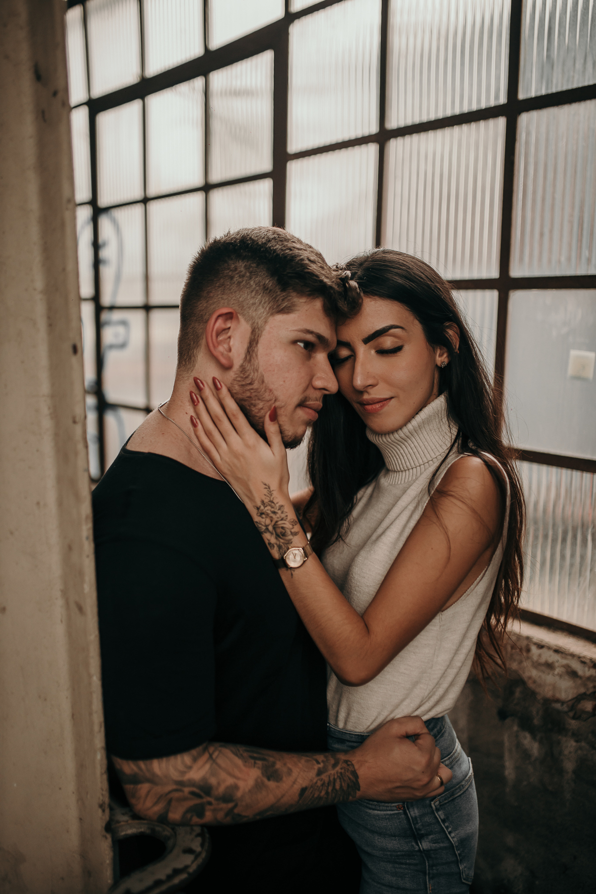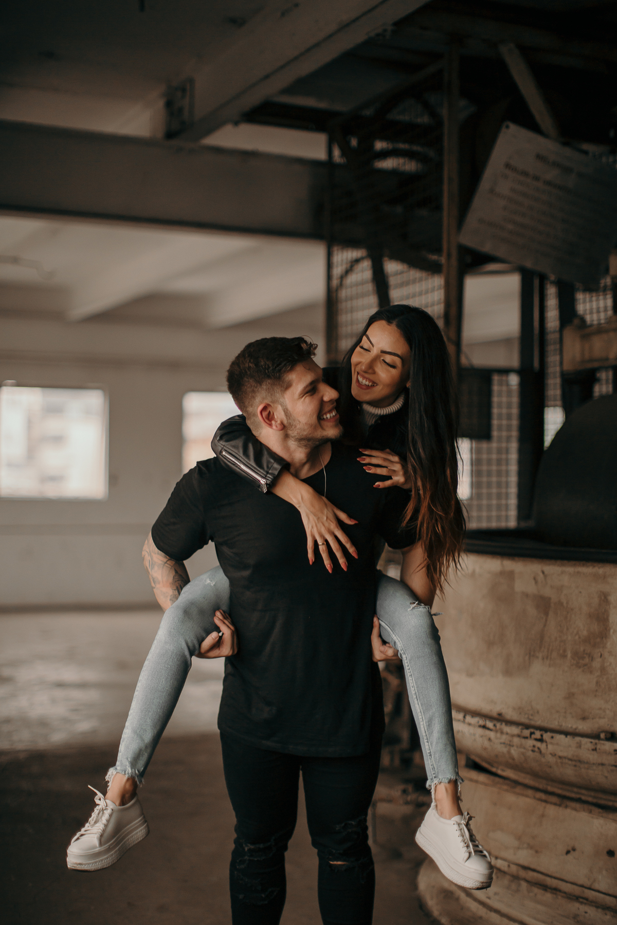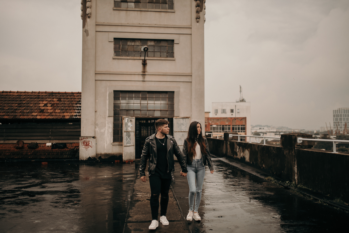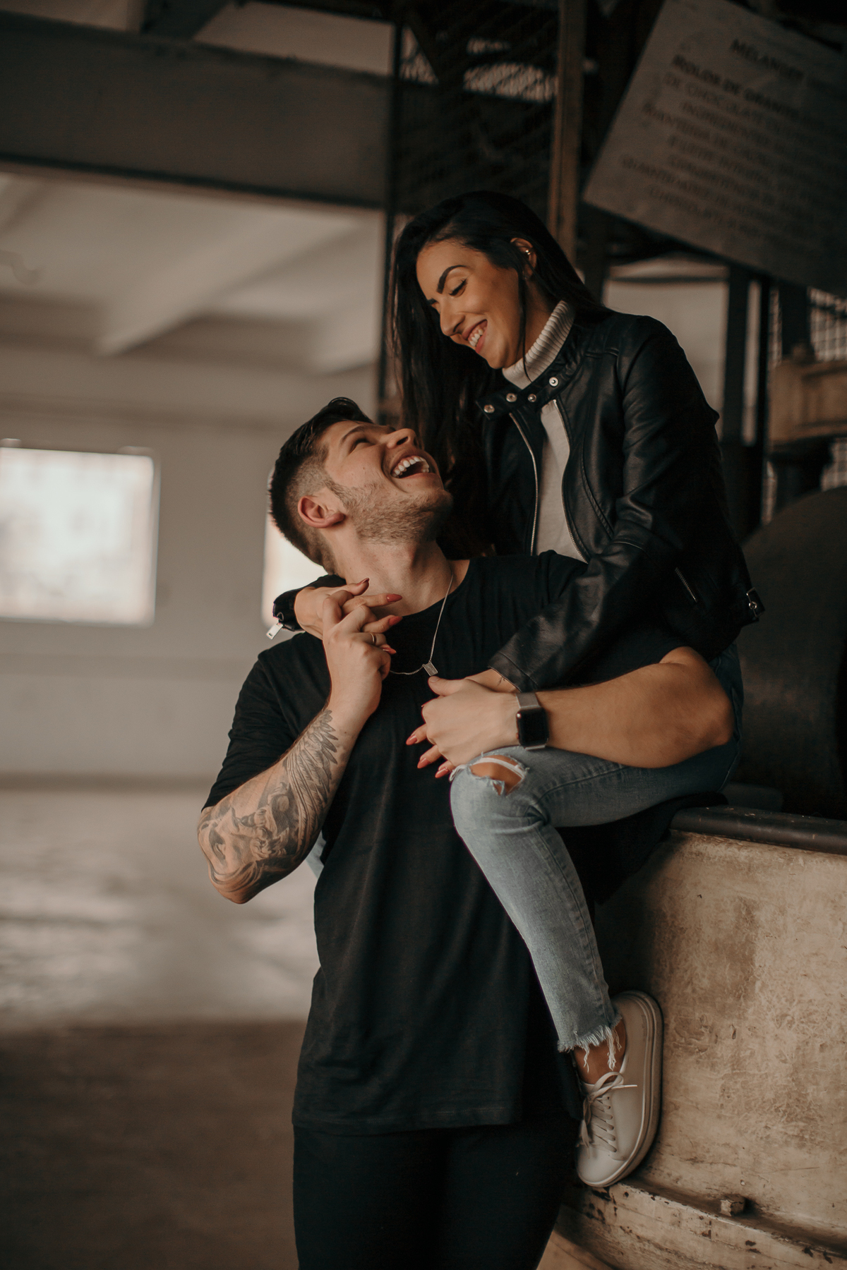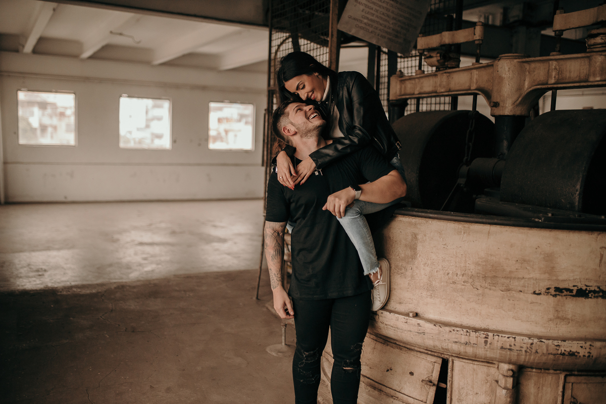 Nós sempre gostamos de conversar para entender mais sobre os nossos casais, Bia faz arquitetura e William super curte uma pegada mais urbana, daí logo pensamos: vamos com eles para a Fábrica Bhering !